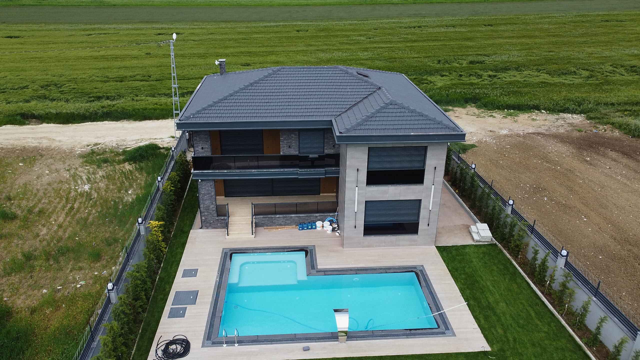Bahçemizde taşmalı havuz ve ateş çukuru yaptık. Dış cephe olarak seramik mantolama kullandık. Böylece, villamıza modern bir görünüm kazandırdık. Ayrıca, balkon kolonlarında taş kaplama kullanarak, villamızın estetik görünümünü artırdık.
